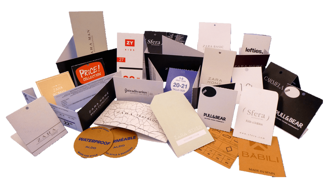 En todo tipo de etiquetas colgantes acorde con su marca (precios, código de barras, composición, talla, logo…).